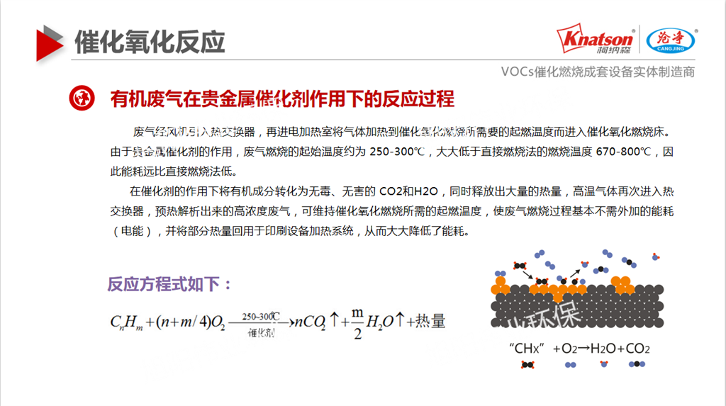 本裝置是利用催化劑做中間體,使有機氣體在較低的溫度下燃燒,生成無害的二氧化碳和水蒸汽排放。