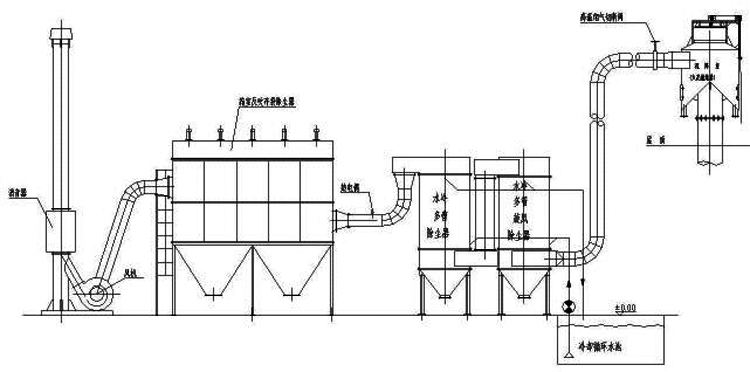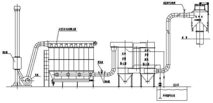 分室反吹袋式除塵設(shè)備系統(tǒng)主要由重力沉降室、高溫?zé)煔馇袛嚅y、水冷多管旋風(fēng)除塵器、水冷多管冷卻器、熱電偶、分室反吹布袋除塵器、調(diào)風(fēng)閥、引風(fēng)機(jī)、消音器、抽塵管道及煙囪和脫硫系統(tǒng)等組成。經(jīng)此除塵設(shè)備后煙塵排放≤50 mg/Nm3(20~50mg/Nm3),除塵效率能達(dá)到99.5%,煙氣黑度(林格曼黑度)小于一級(jí),SO2達(dá)到排放標(biāo)準(zhǔn),是沖天爐環(huán)保除塵設(shè)備的。