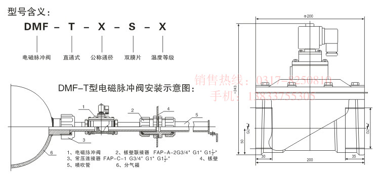 DMF-T型電磁脈沖閥為直通閥,其進(jìn)氣口之間夾角為180°,(進(jìn)出口中心線為同一直線),其進(jìn)口與儲氣筒連接,出口與噴吹管連接。氣流暢通,能提供符合要求的清灰氣脈沖。
